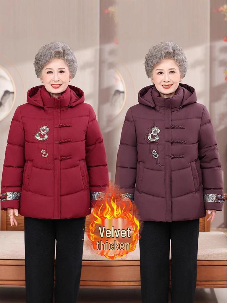 Discover ultimate winter warmth and comfort in this stylish cotton jacket designed specifically for middle-aged and elderly women. This jacket features a plus velvet, thickened, and padded design, ensuring you stay cozy during the coldest months. Crafted from high-quality polyester, the outerwear is insulated with a soft Sintepon filling, providing exceptional heat retention. The jacket's tailored neckline adds a touch of elegance, while the practical pockets offer both convenience and a chic decorative element. Enjoy both style and functionality with this must-have winter essential for moms.