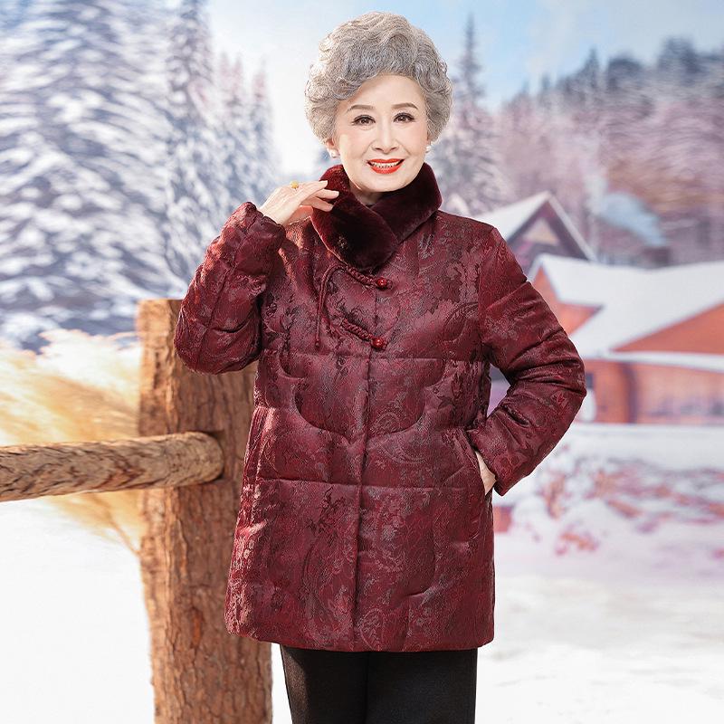This luxurious winter jacket is designed specifically for women ages 70 and above, offering exceptional warmth and comfort. Filled with 90% white duck down, it ensures optimal insulation during the coldest months. The outer shell and fur detailing are crafted from high-quality polyester, providing both durability and a stylish finish. The jacket combines functionality with elegance, presenting a chic option for winter wear that is as cozy as it is fashionable.