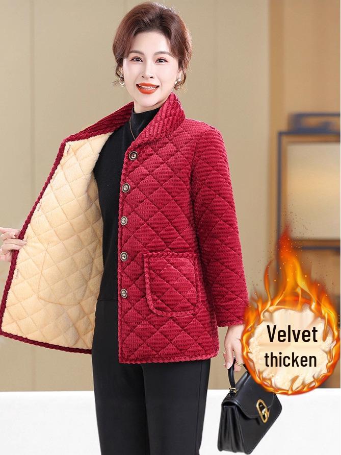 Stylish Plus Size Corduroy Fleece-Lined Jacket for Middle-aged & Elderly Women