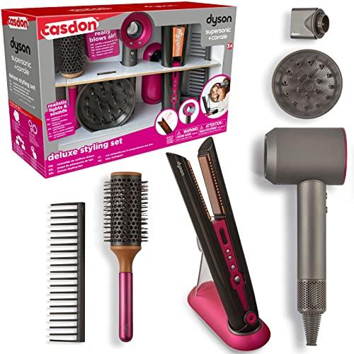 The Dyson Supersonic + Corrale Deluxe Styling Set is a hair styling play set featuring a hair dryer with an illuminated light that lights up when turned on, and a curling iron that lights up and makes a whoosh sound when closed.