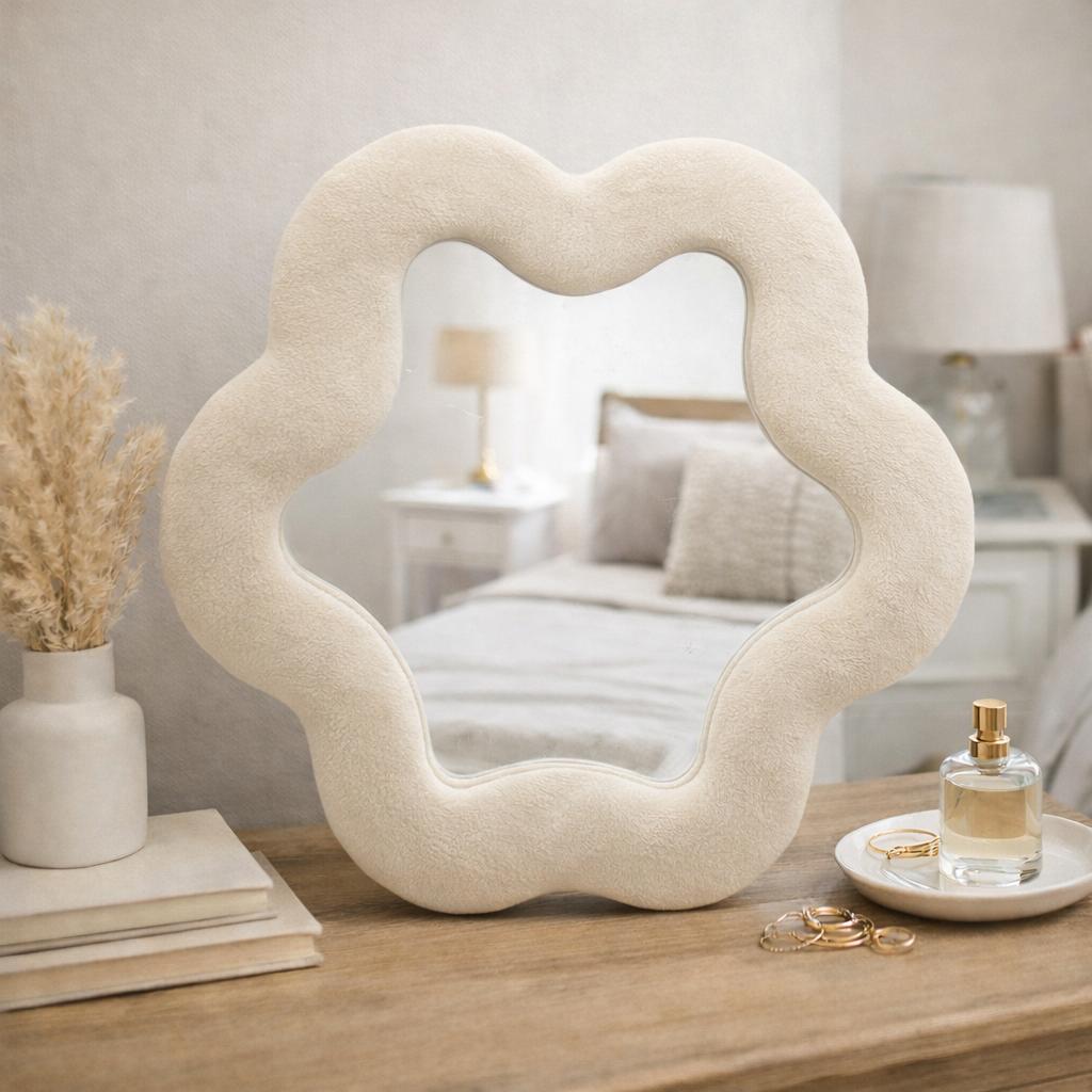 Wandspiegel in Blumenform — weicher, gepolsterter Rahmen mit beflockter Stoffoberfläche