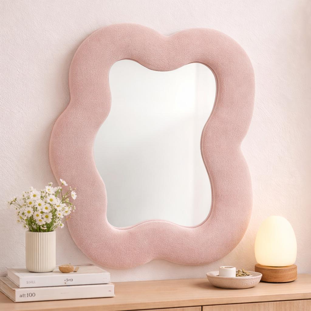 Wandspiegel in quadratischer Kieselsteinform — weicher, gepolsterter Rahmen mit beflockter Stoffoberfläche, weich geformte Rechteckform mit abgerundeten Ecken