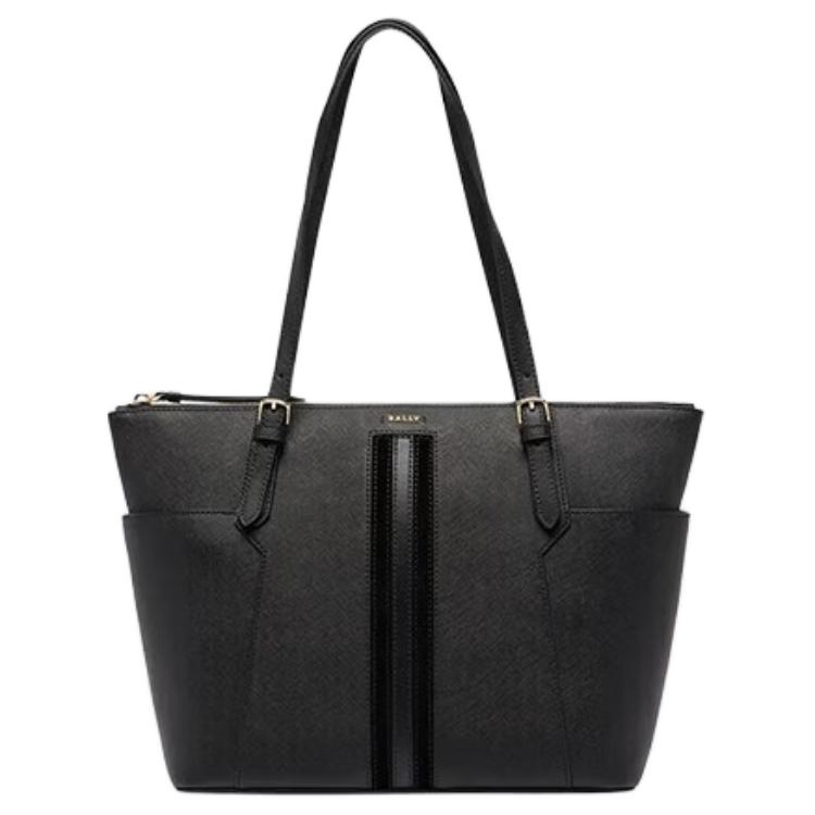 Bally Zipper Closure Striped Decorative Design Embossed Cowhide Tote Handbag Large Women tote Black Light-Gold 6306270