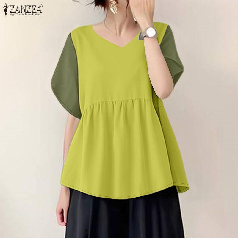 ZANZEA Women Casual V-Neck Patchwork Short Sleeve Loose Blouse