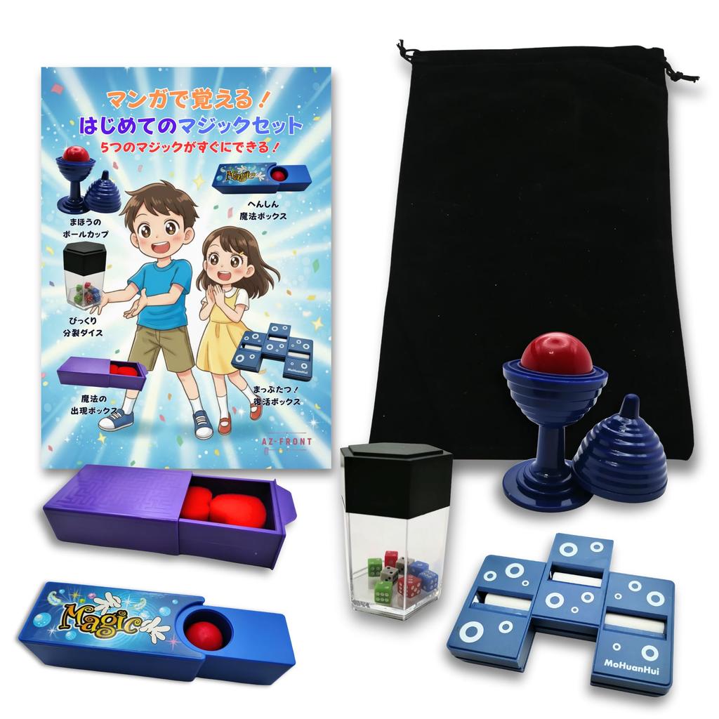 "Wow, that's amazing!" Recommended for those who dream of becoming a magician! You'll be amazed from the moment you receive it. This fun magic set, with both manga and video explanations, will turn you into a magician in no time. Features: ・[Manga + Video Explanation] Every step is explained in a fun manga! Plus, you can access demonstration and reveal videos via QR codes, so you can perfectly master the movements and timing. ・[Dedicated Magic Pouch] Comes with a comfortable pouch to store all your magic tools after play. Cleanup is easy and you won't have to worry about losing them. ・[5 Carefully Selected Magic Tricks] This set includes five magic tricks that will thrill children: "Split! Resurrection Box," "Transforming Magic Box," "Amazing Split Dice," "Magic Appearance Box," and "Magic Ball Cup." (Note: The official name of "Disappearing Ball" has been corrected.) Show them off at birthdays and Christmas parties and you'll be an instant hit! This set is sure to make a wonderful gift. Set contents: ・5 kinds of magic tools ・Our original manga instruction manual (with video explanation QR code) ・Special magic pouch (storage bag) Now, this magic set