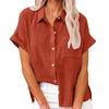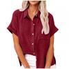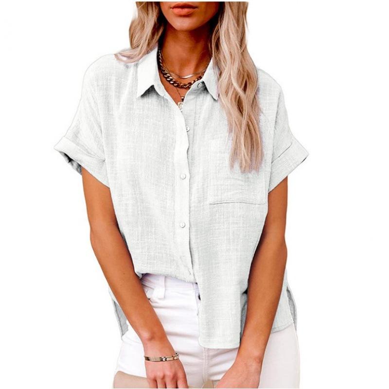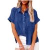 Frauen Sommer Einfarbig Baumwolle Leinen Shirts Revers Kurzarm Button Up Unregelmäßige Tasche Blau Weißes Hemd
