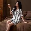 Erleben Sie die ultimative Mischung aus Komfort und Stil mit diesem luxuriösen Pyjamaset für Damen. Gefertigt aus hochwertiger Eis seide, umfasst das Set ein kurzärmeliges Oberteil und eine passende Shorts, die sich weich, atmungsaktiv und seidig-glatt auf der Haut anfühlen.. Das attraktive Streifenmuster verleiht einen schicken Touch und macht es sowohl für gemütliche Stunden drinnen als auch für legere Outdoor-Outfits geeignet.. Genießen Sie Entspannung und Eleganz mit diesem vielseitigen und modischen Set.