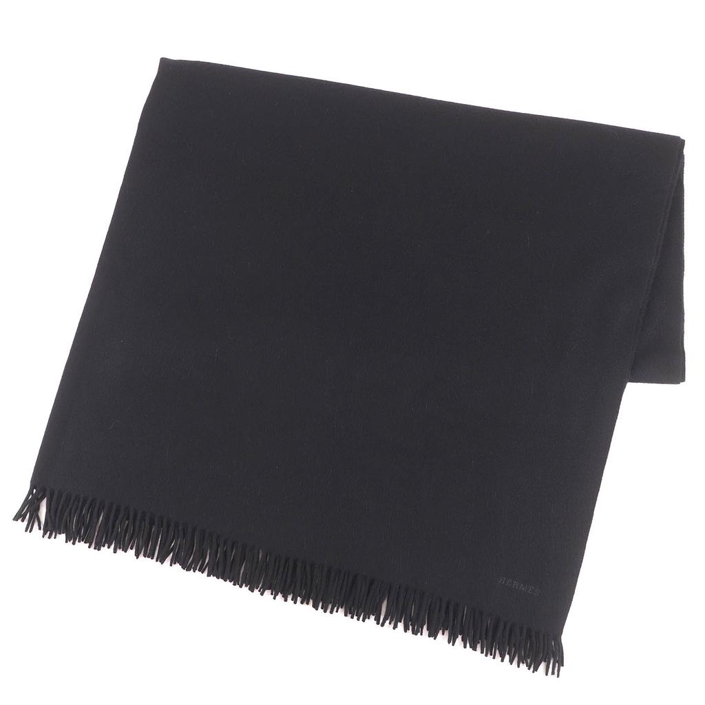 Great HERMES Logo embroidered fringe extra large shawl stole black cashmere Used