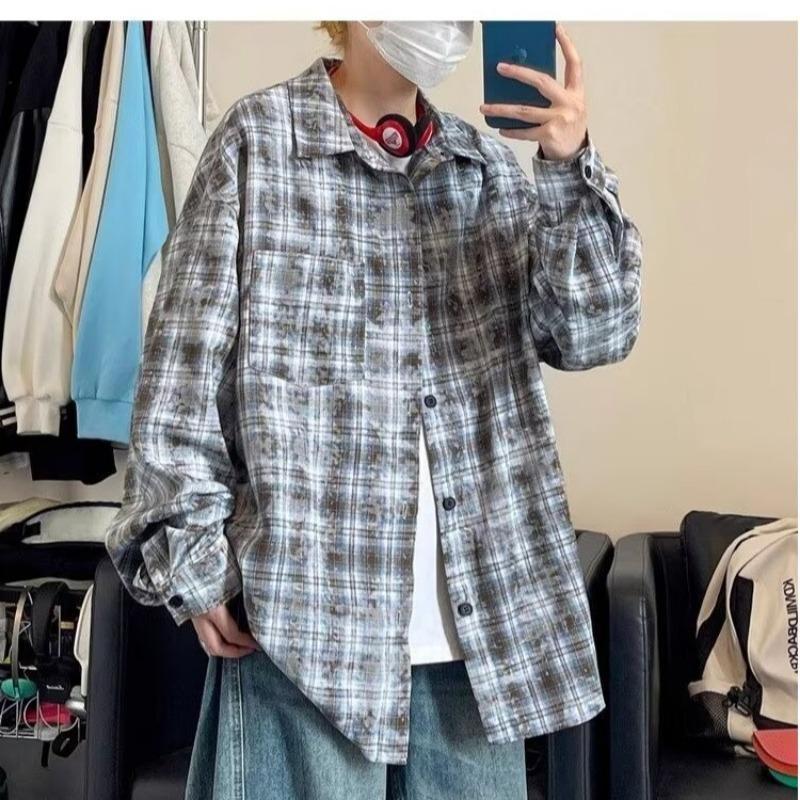 Spring and autumn high-end retro tie-dye plaid shirt men's long-sleeved versatile simple jacket