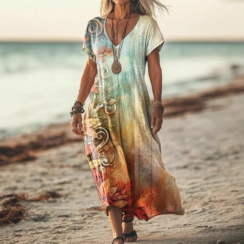 2026 Summer Women's Dress Short-sleeved Retro Shuttle Printed V-neck Casual Fashion Beach Long Skirt