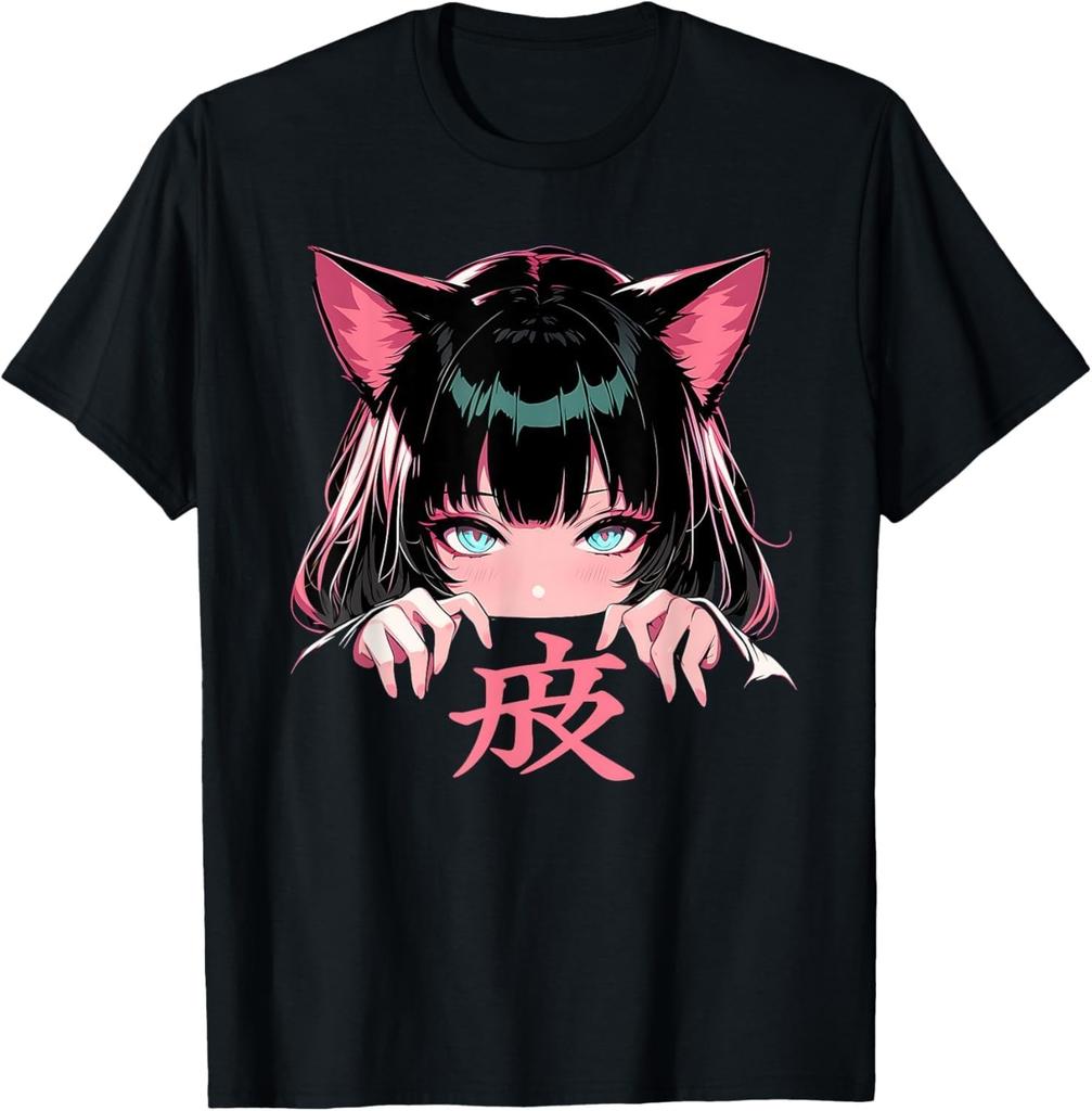 QRXYTVEIMN Anime Waifu Niedlich Anime Manga Katzenmädchen Süß Retro Japan T-Shirt