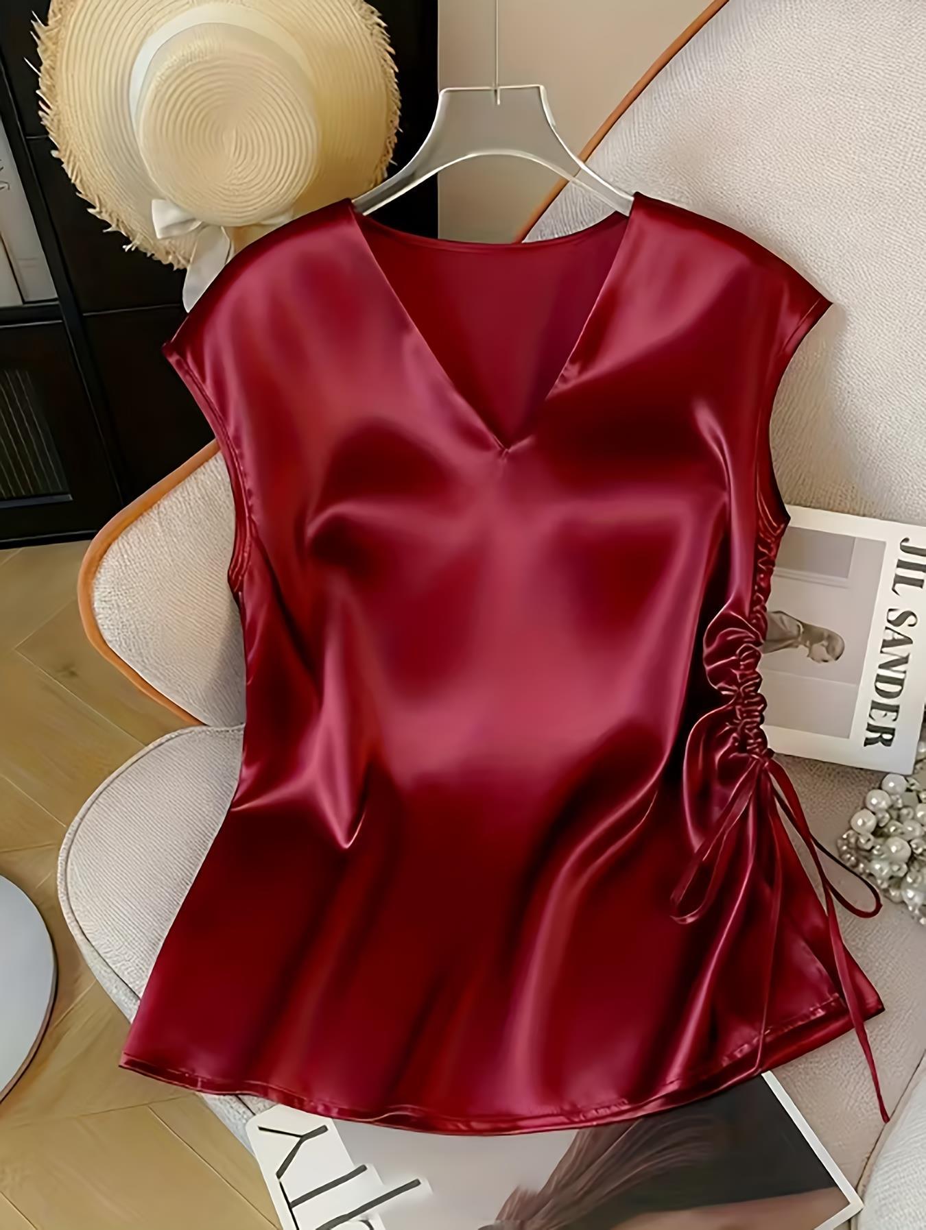 Einfarbige Satin-Kurzarm-T-Shirt-Bluse für Damen, Sommerlich Dünn und Stilvoll, V-Ausschnitt, Slim Fit
