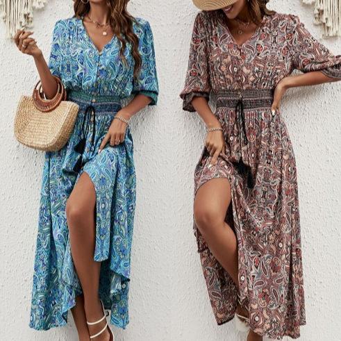 V-neck Printed Tulle Waist Bohemian Dress Holiday Buttoned Beach Maxi Dress