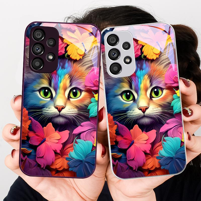 Bunte Blumenkatze Grün Für Samsung Galaxy S24 Plus S20 21 FE S23 Ultra S8 9 A70 72 73 50 51 52 53 Gehärtetes Glas Handyhülle