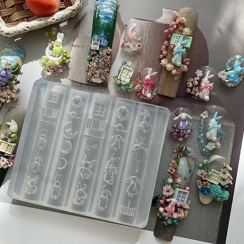 Cute Nail Mold Silicone Rabbit Paradise Moon Castle Art Elegant Oil Painting Style Nail Stereoscopic Template Mold