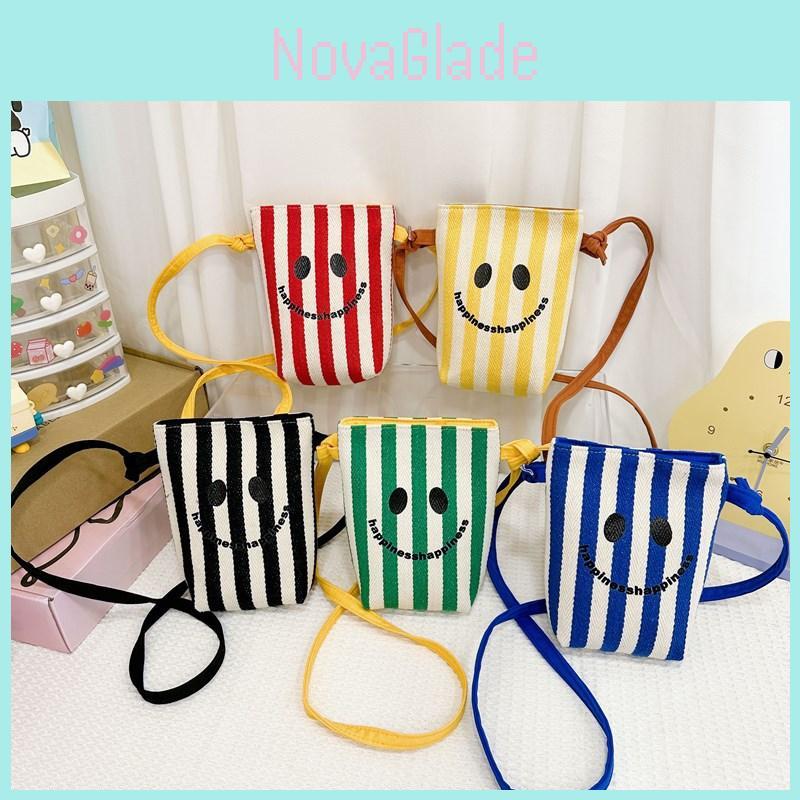 Stylish Mini Canvas Shoulder Bag For Kids With Cute Smiley Face And Striped Design
