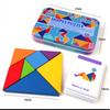 Unser magnetisches Holz-Tangram-Puzzle ist in zwei lebendigen Verpackungsoptionen erhältlich: eine elegante große Blechdose und eine fröhliche gelbe Blechdose.