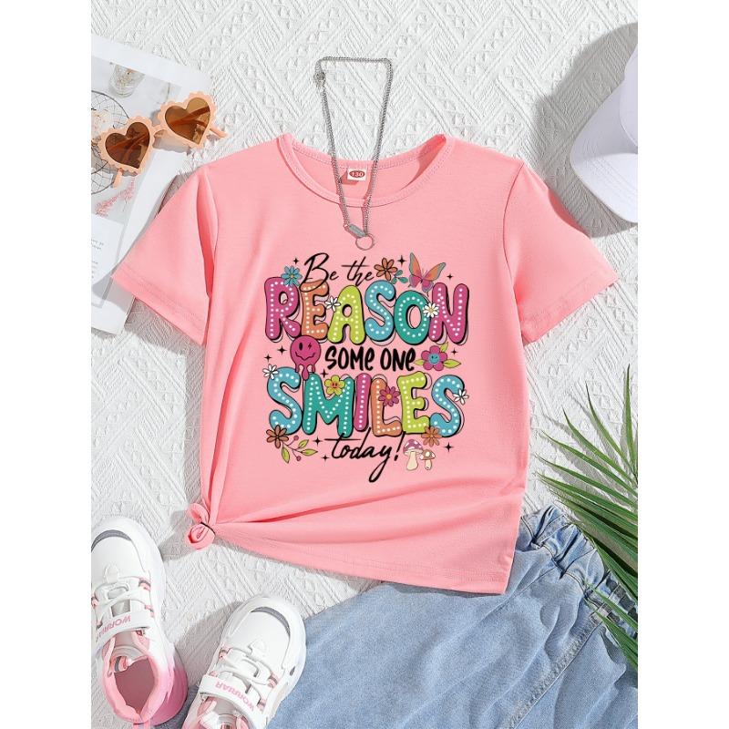 Cute And Easy Cartoon Letter Print Short-Sleeve T-Shirt for Girls, Perfect for Summer Wear, Knit