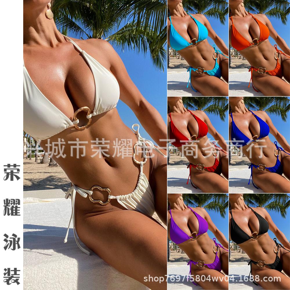 Swimsuit women's new black split bikini three-point neck low waist sexy solid color two-piece swimsuit