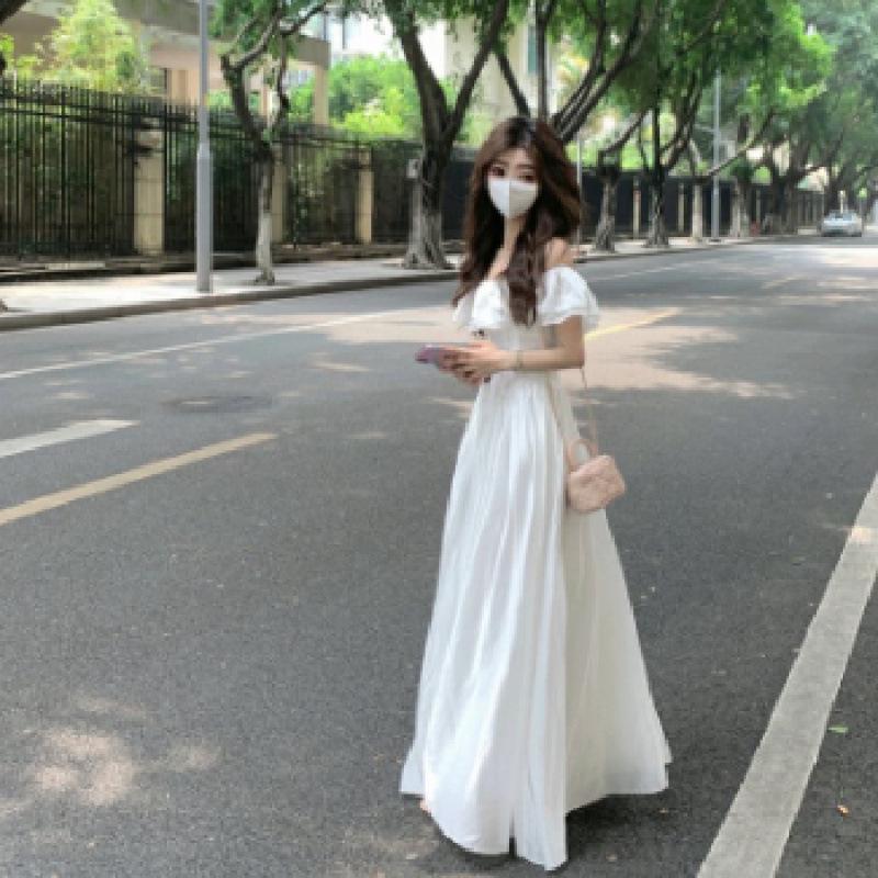 Women's White Off-Shoulder Ruffle Dress - Summer Vacation French Style, Slimming Waist, Backless, Long Design