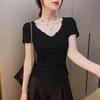 Damen gerafftes V-Ausschnitt T-Shirt Kurzarm Rüschenbesatz Slim Fit Lässiges Oberteil Einfarbig
