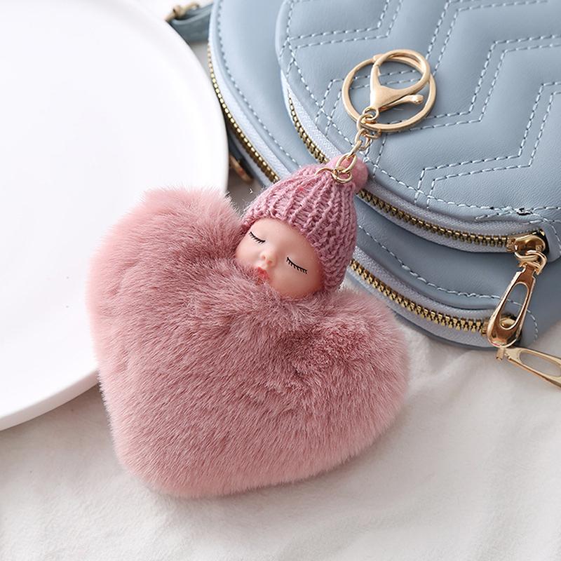 Plüsch Pfirsich Herz Pompon Schlafendes Baby Puppe Schlüsselanhänger Schlüsselanhänger Halter Tasche Für Frauen Mädchen Mode Schmuck Geschenk Charmante Dekoration
