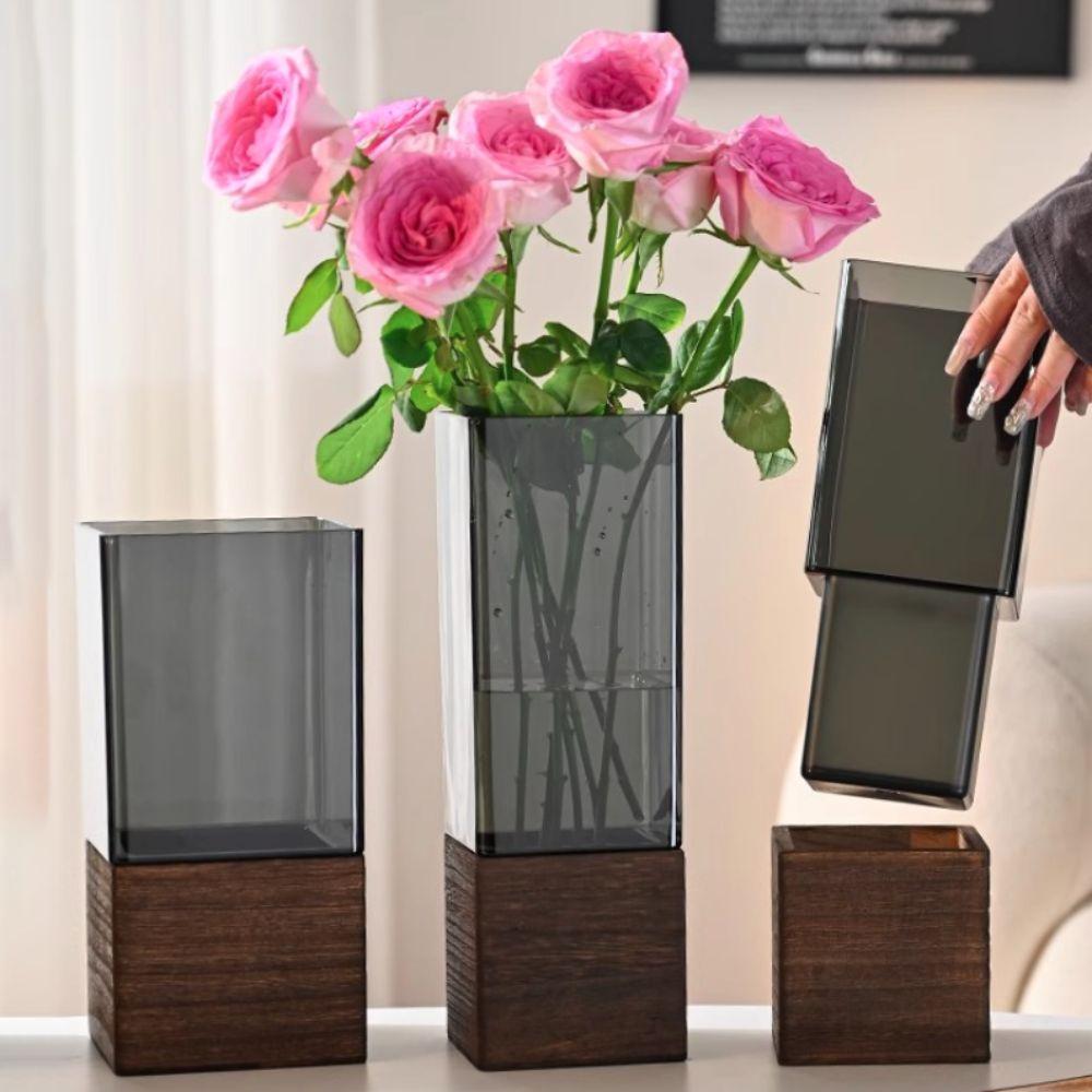 Wooden Base Acrylic Flowers Vase Transparent Light Luxury Vase Simple Hydroponic Vase Living Room