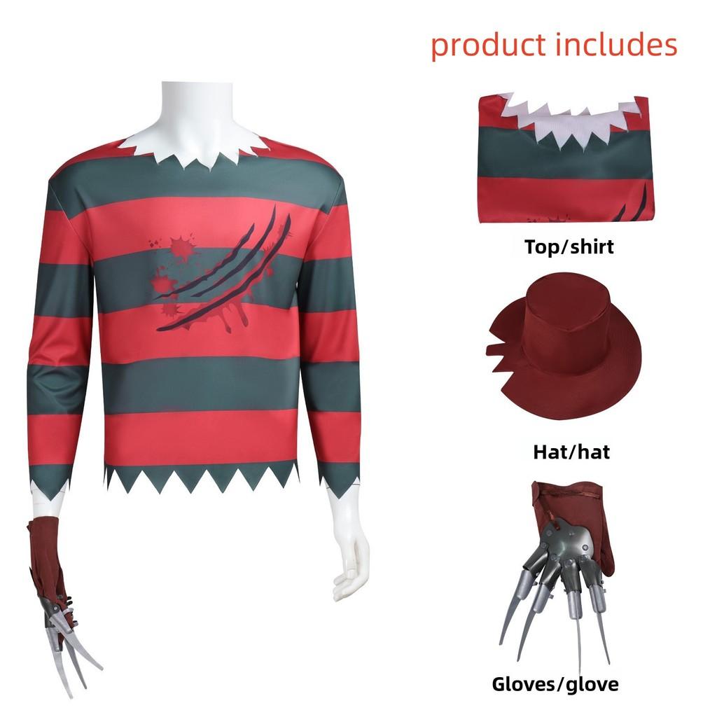 This Freddy Krueger striped shirt is designed for cosplay and costume enthusiasts, supporting immersive role play for Halloween or themed events. Constructed from durable polyester fabric, it measures approximately 24 inches in length and fits sizes XS to XXXL. The shirt features bold red and green stripes, capturing the iconic character look. Ideal for movie-inspired parties or cosplay gatherings, it offers comfortable wear. To maintain its vibrant appearance, hand wash and air dry are recommended.