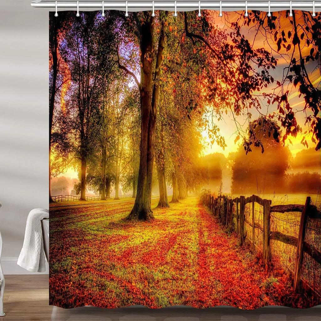 Herbstdeko Duschvorhang-Sets, Herbstwald Goldene Blätter Bauernhaus Natürlich Polyestergewebe Badvorhang Badezimmerzubehör