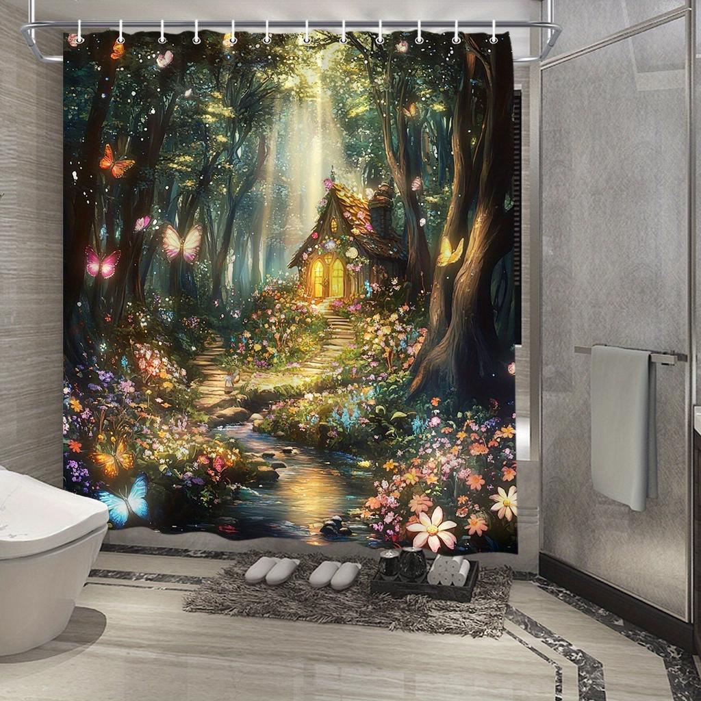 Verzauberter Wald Fantasy Duschvorhang - Mehrfarbige Schmetterlinge & Blumen, Rustikales Hüttendesign, Polyester