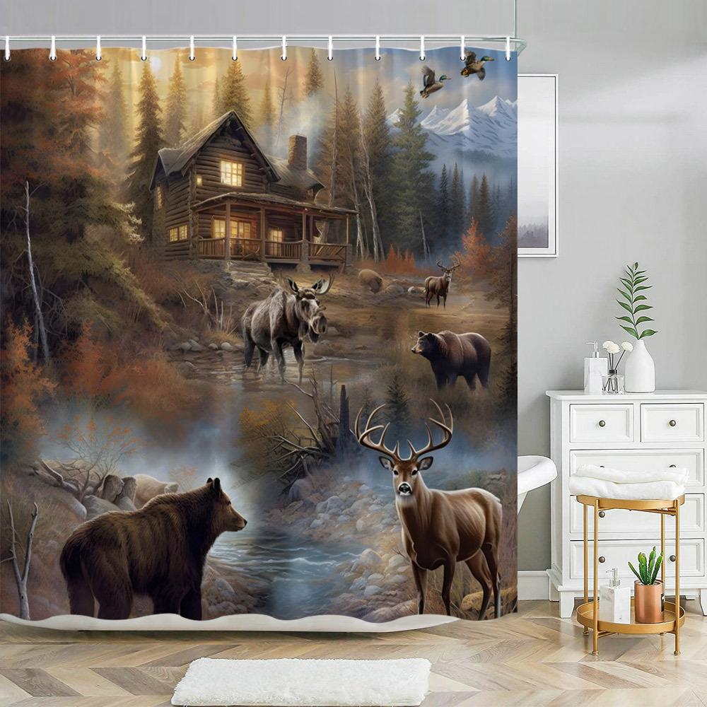 Rustikaler Waldtiere Duschvorhang Bär Elch Hirsch Ruhige Herbstszene Polyester mit 12 Haken Hütten-Thema Badezimmerdekoration