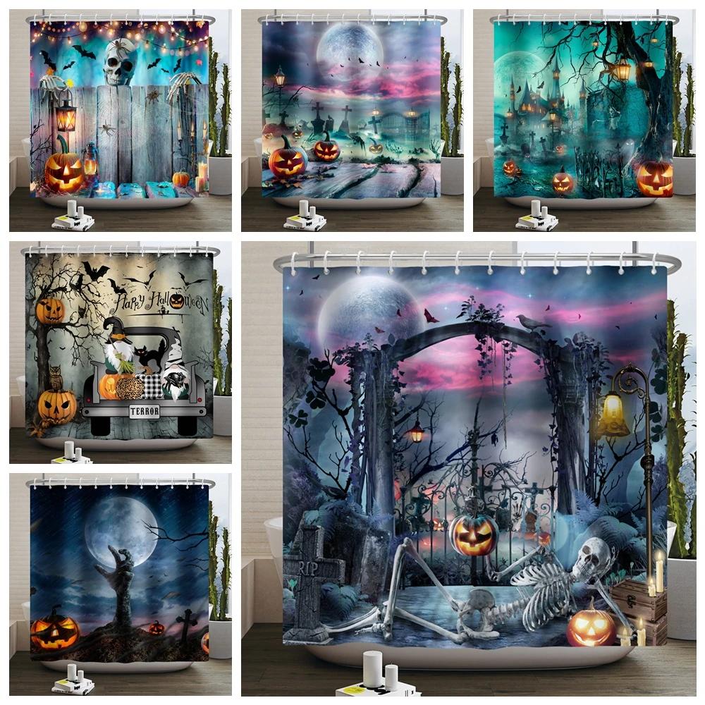 Halloween Duschvorhang Horror Mondnacht Kürbis Schädel Skelett Gruseliges Schloss Hexe Geist Friedhof Wasserdicht Badezimmervorhänge