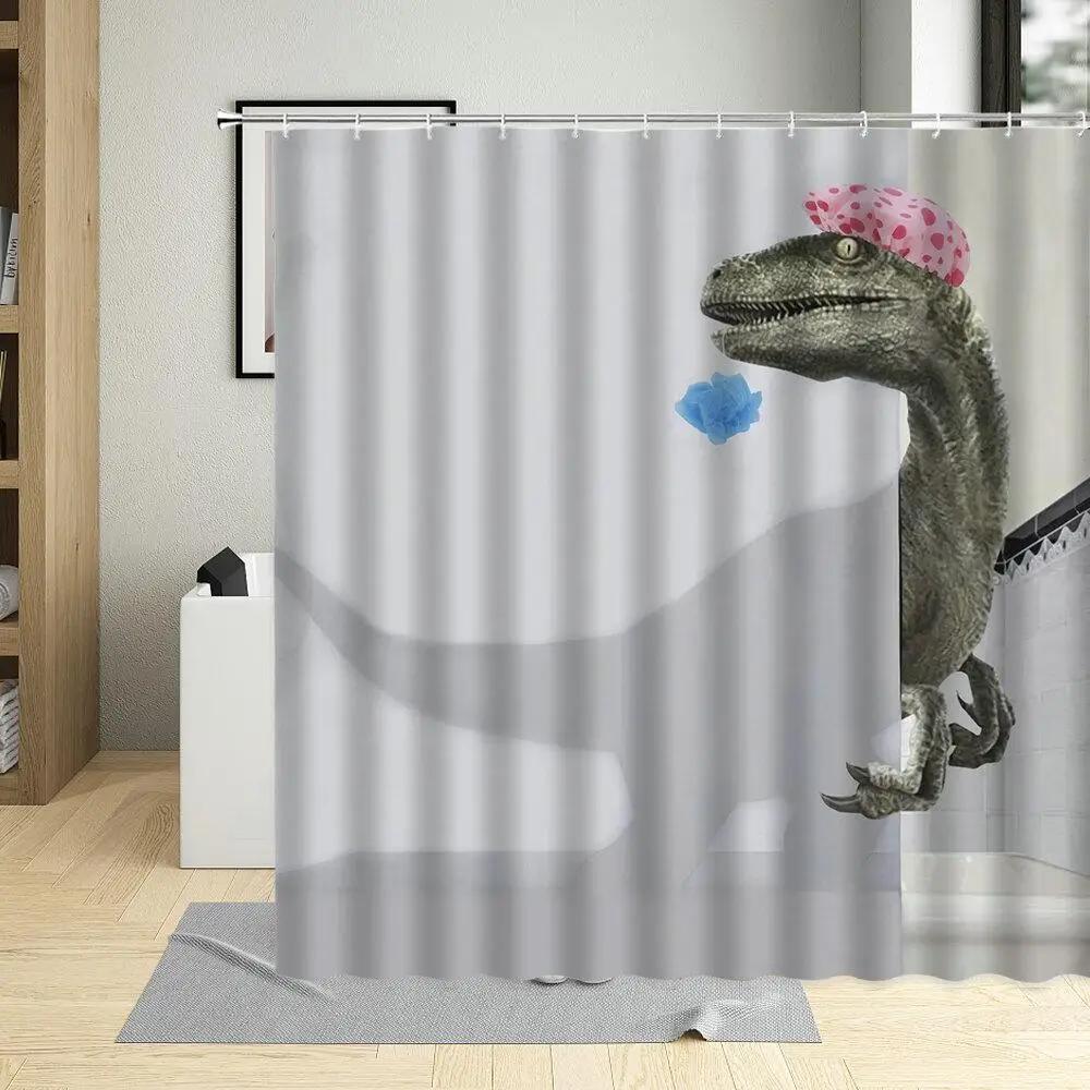 Funny Dinosaur Shower Curtain Dino Kid Cute Cartoon Children Animal Fun Girl Boy White Grey Polyester Fabric Hook Bathroom Decor
