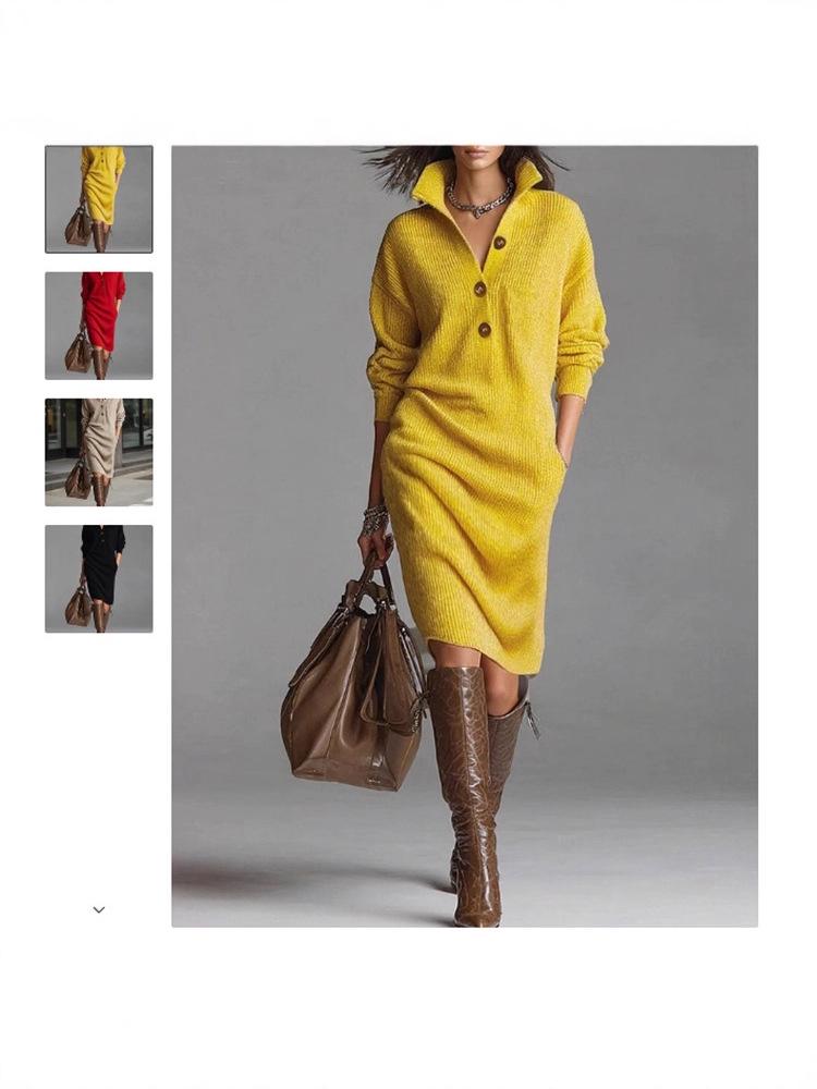 2025 Europäisches & Amerikanisches Lässiges Herbst-Strick-Midikleid mit Knopfleiste und Kragen