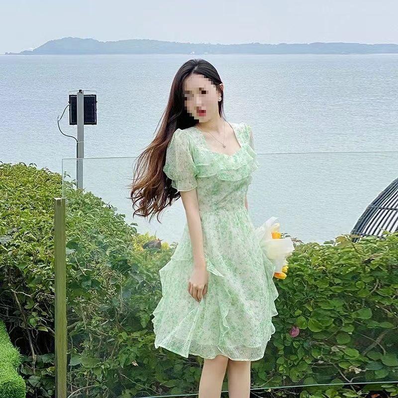 Elegantes kleines grünes Blumen-Chiffonkleid mit Rüschen-Taille für Sommer-Strandurlaube (Kollektion 2025)