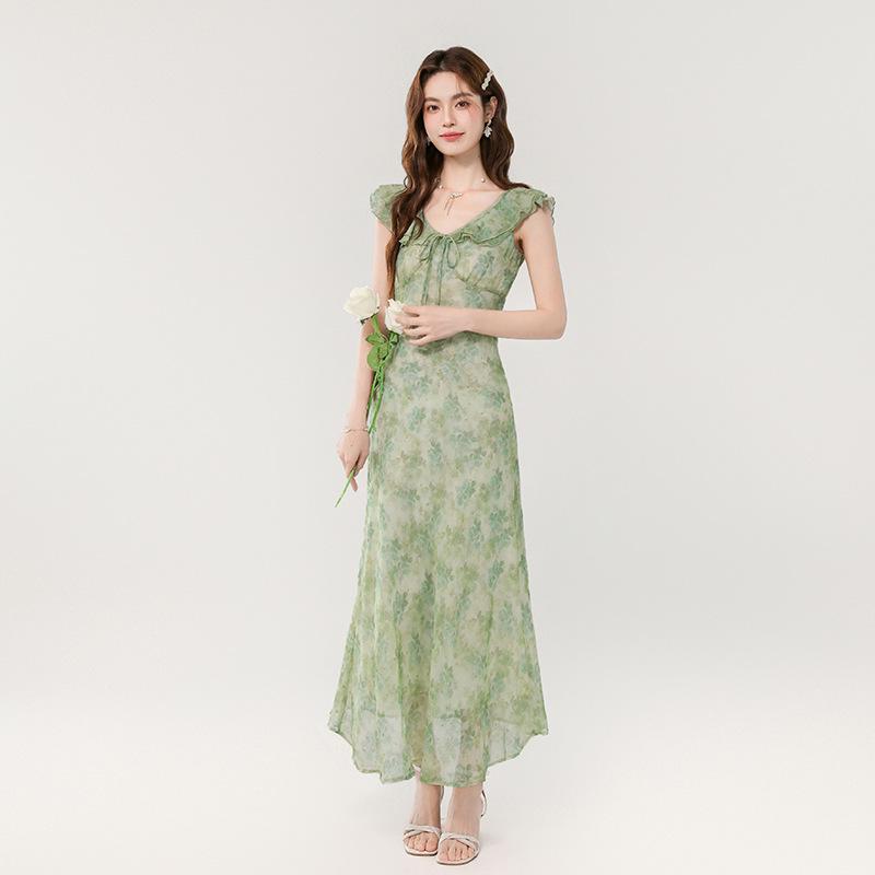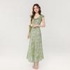 Damen Floral V-Ausschnitt Grünes Kleid - Frühling/Sommer 2026, Urlaubsstil, Fledermausärmel, Tailliert.