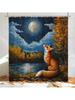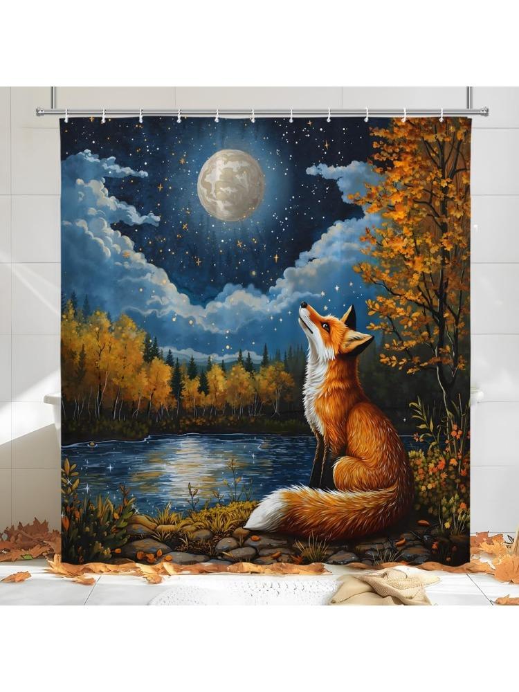 Fox Shower Curtain Autumn Forest Moon Night Scene Starry Sky Wildlife Comping Hunting Nature Lake Fall Maple Leaf Watercolor