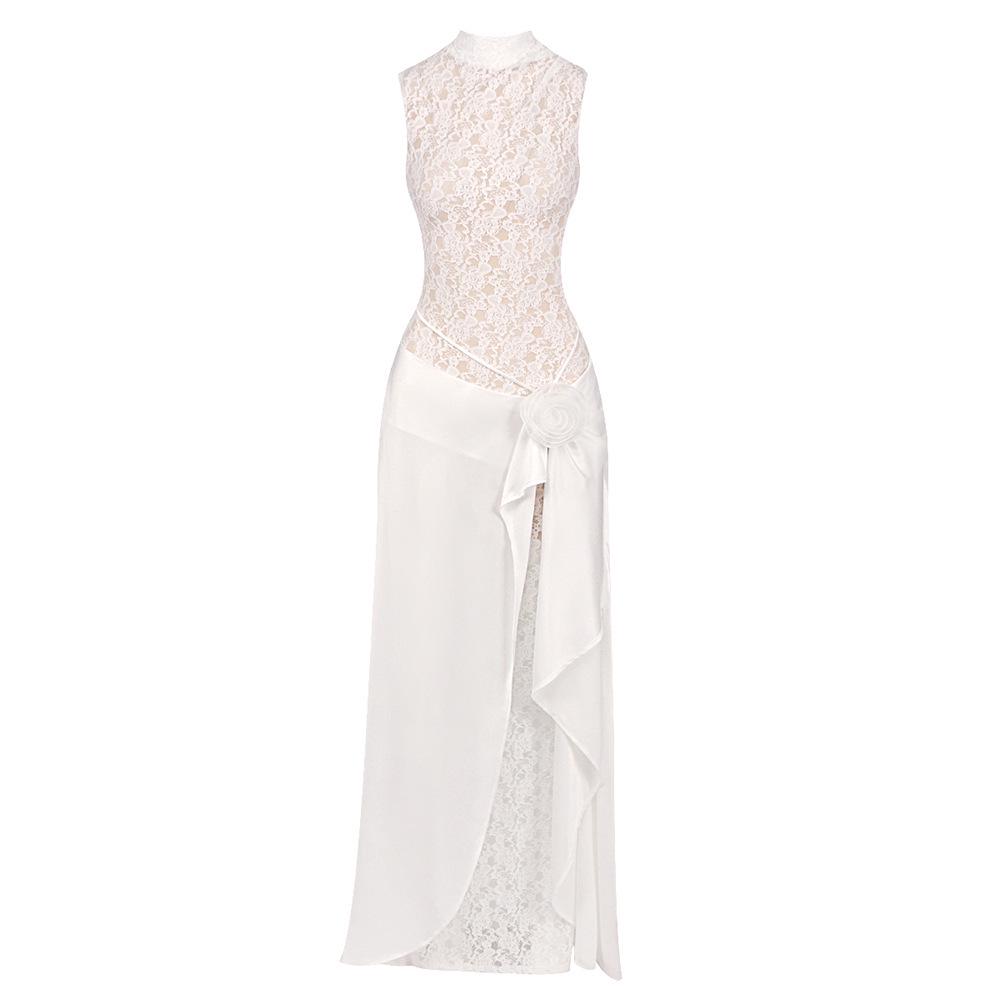 Elegant White Floral Lace Sleeveless Evening Gown