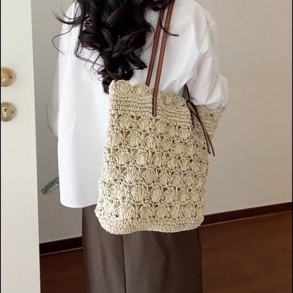 Handgewebte Strohtasche für Damen Sommer-Strandtasche mit Ledergriffen und Muschelmuster-Design