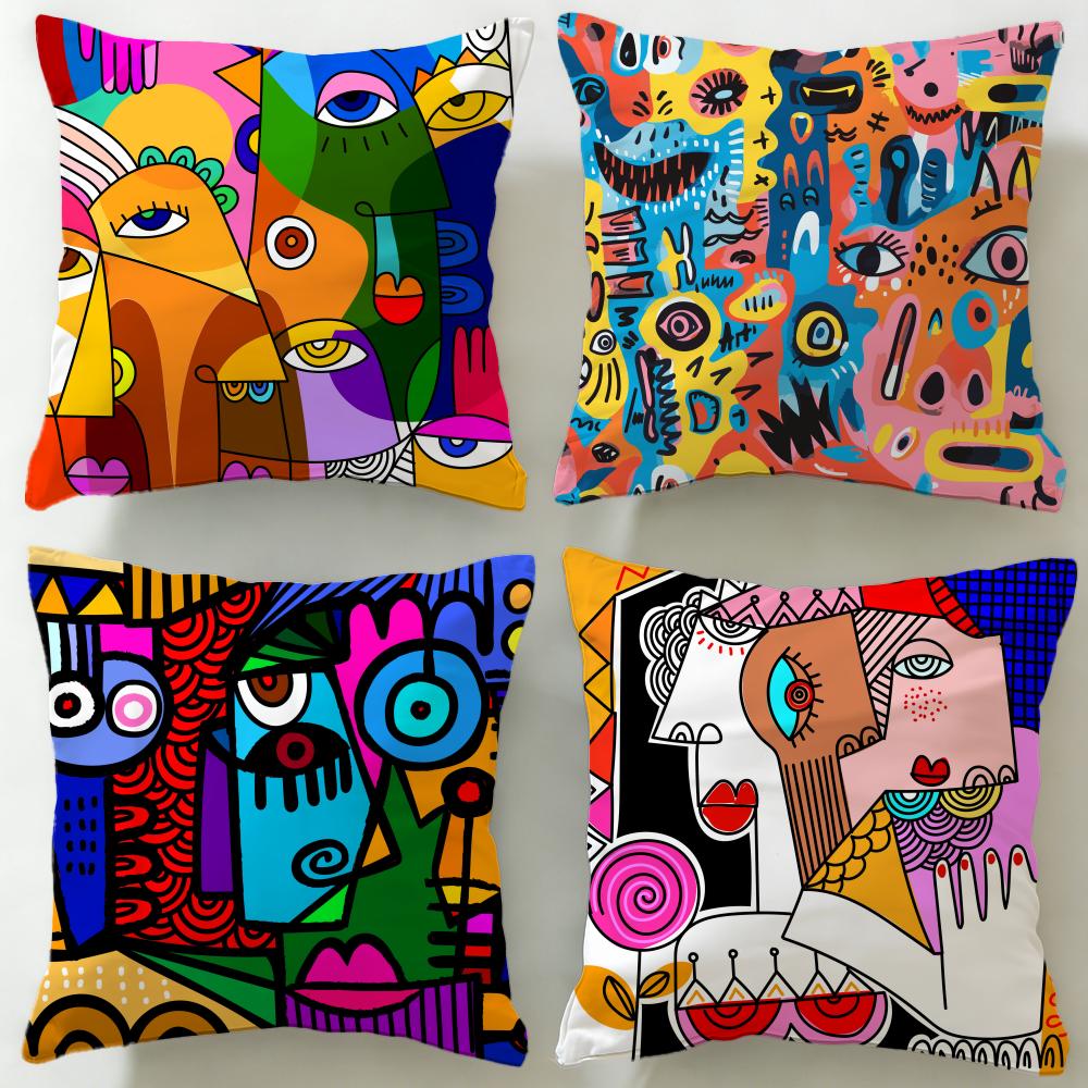 art theme Colorful Abstract Faces Cushion Cover Soft EasyWash Pillow Case Versatile for Couch Bed Travel and Office