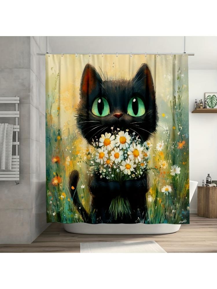 1 Stück Charmante Schwarze Katze mit Grünen Augen Duschvorhang, Strapazierfähiges Polyester, Waschmaschinenfest, für Badezimmer- und Fensterdekoration