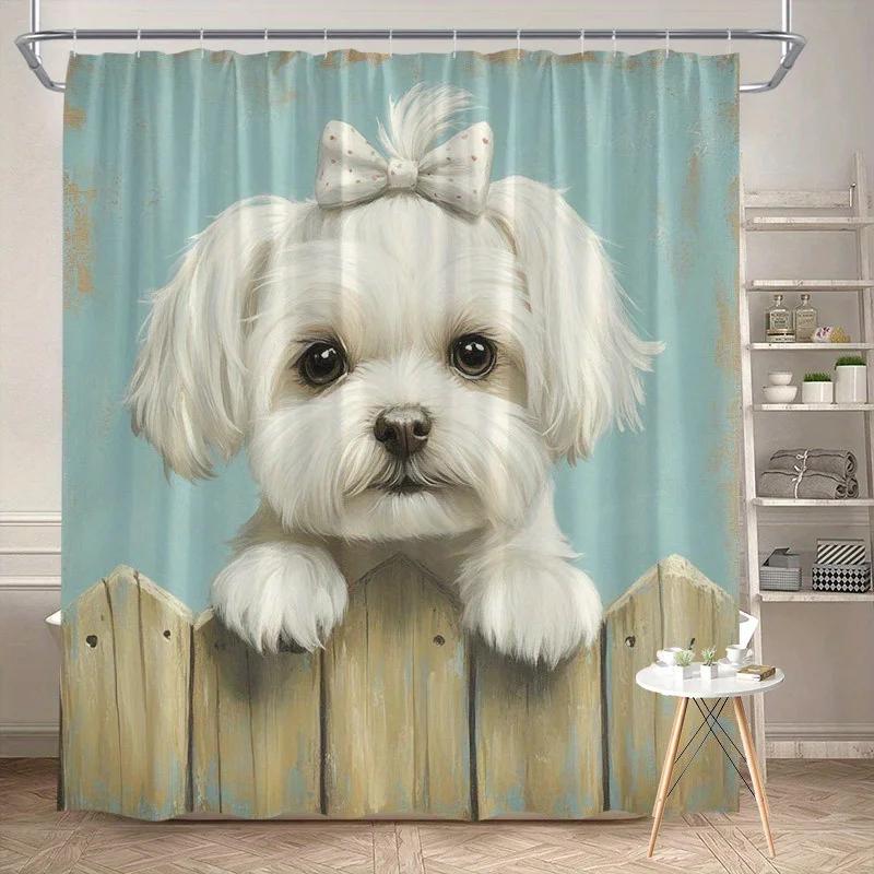 Cute White Puppy Shower Curtain: Polka dot bow, blue fence design, polyester,, 12 hooks, washable, playful dog theme.