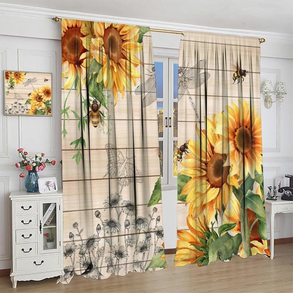 Farmhouse Sunflower Curtains Country Vintage Floral Wooden Board Art Printed Window Drapes Bedroom Kitchen Decor Room Darkening Polyester Master