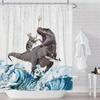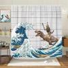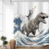 Lustige Katze reitet auf Dinosaurier Duschvorhang Niedliches Tier Meereswellen Surfbrett Kreatives Kinder Badevorhang Set Stoff Badezimmer Dekoration Polyester Fenster
