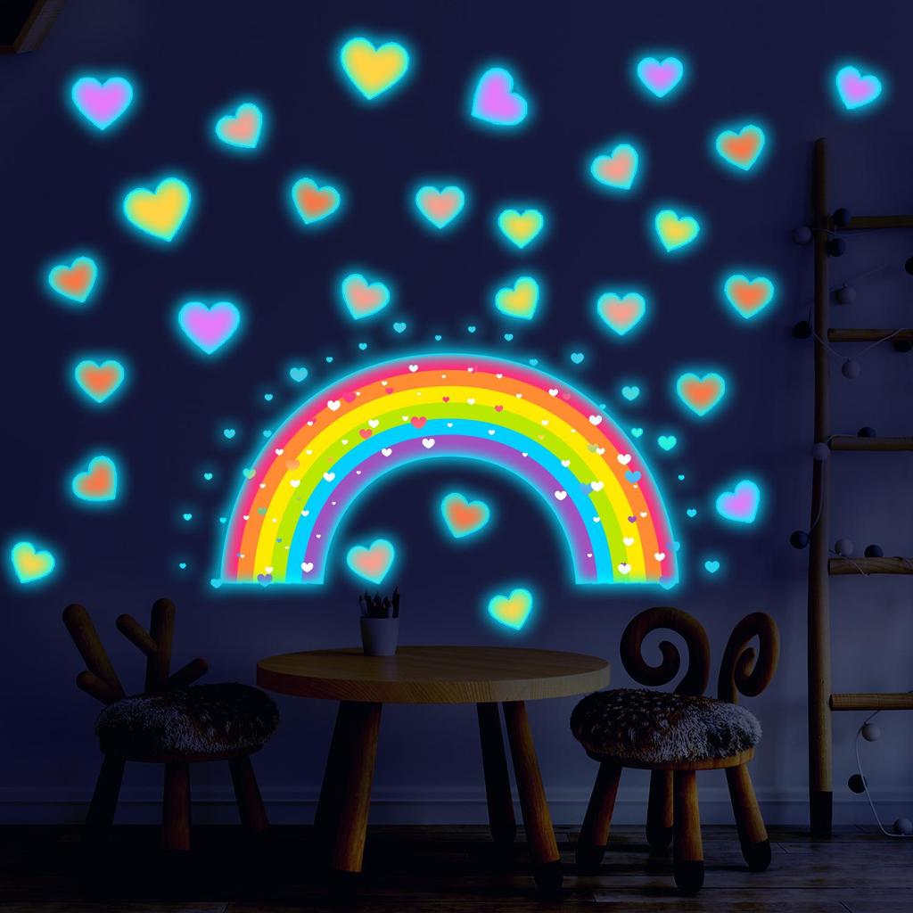 Glow-in-the-Dark Heart Stickers for Bedroom Decoration - Fluorescent Rainbow Self-Adhesive Wall Stickers