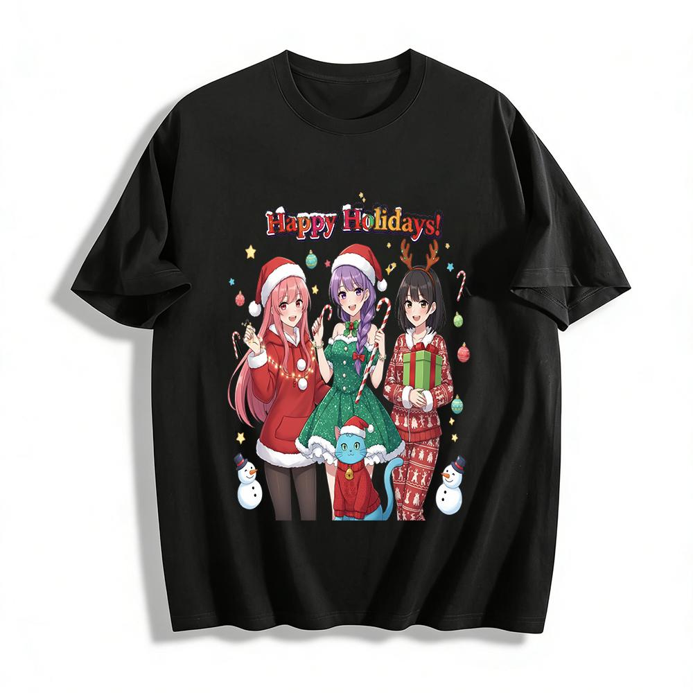 Happy Holidays Anime Girls & Cat Print Sweatshirt Festive Casual Top for Men Women Pure cotton T-shirt
