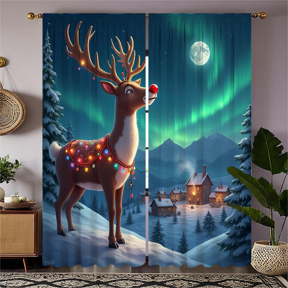 Festive Christmas Reindeer Snow Forest Printed Curtains High Definition Digital Print Green Scarf Red Hat Design Se Curtain Set Of 2 Made Polyester