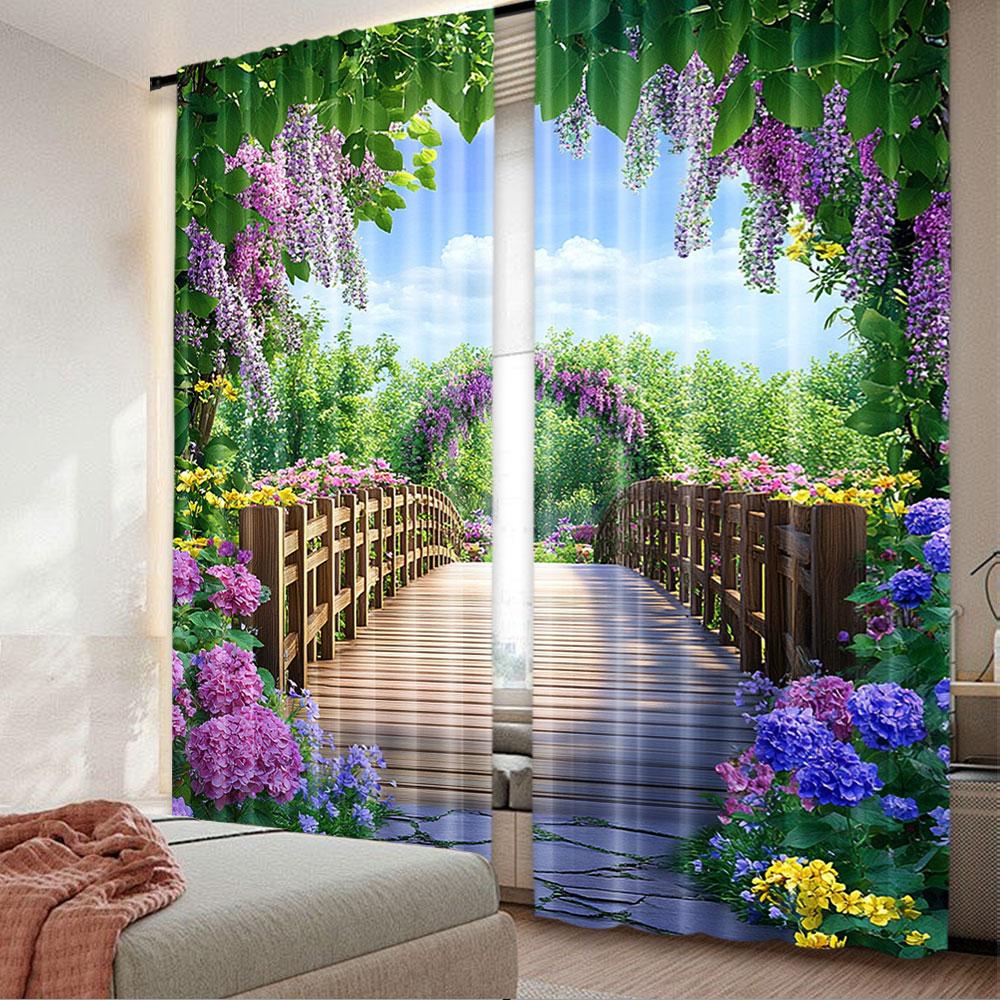 Bunte Blumen blühen Vorhang Holzbrücke Blumengarten Wohnzimmer Schlafzimmer Viele andere Anlässe Vorhänge Set von 2 Hergestellt Polyester Sitzdekor