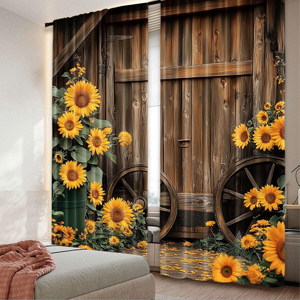 Set aus 2 Vintage-Sonnenblumenmuster-Vorhängen Holzhausrad Geeignet für Wohnzimmer Schlafzimmer Bauernhaus-Vorhang Polyester Ideal für Groß