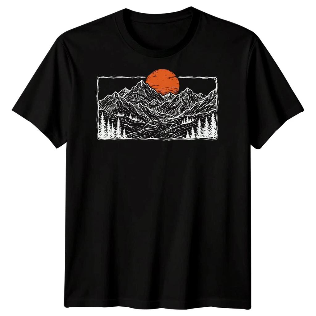 Berglandschaft Wandern Draußen Herren T-Shirt Vintage Holzschnitt Landschaft Tee